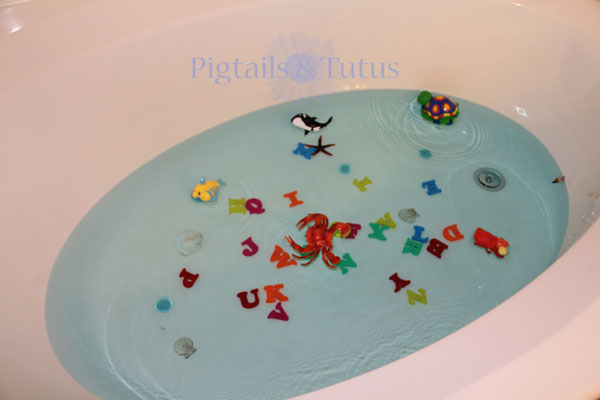 Fill up your bath tub with water and add a drop of blue food coloring to set the scene. Add magnetic letters to the water as fish. Find a toy fishing pole and add a magnet to the end of the string. See who can get the most fish. Add other wildlife by adding magnets to shells, plastic animals even small plastic dolls.